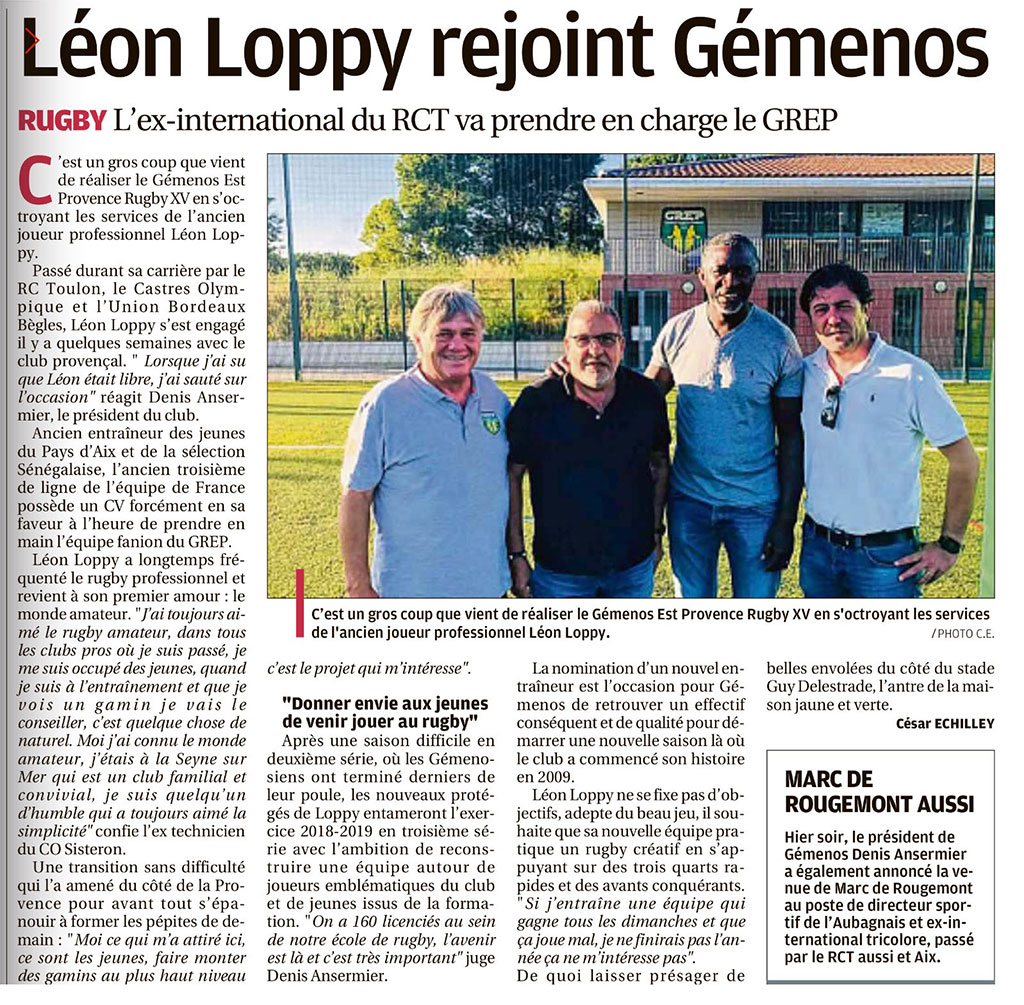 LÉON LOPPY est le nouvel entraîneur de la catégorie seniors ! Les joueurs et les amateurs de rugby de compétition en quête d’une équipe de 2e Série seront servis et n’ont plus qu’à se manifester, un groupe les attend déjà pour la prochaine saison 2018-2019.